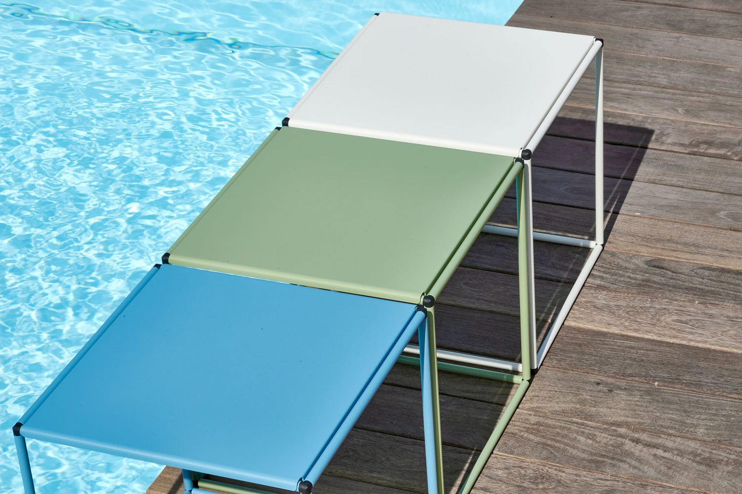Made for outdoor use with aluminium tubes and special coated table tops.